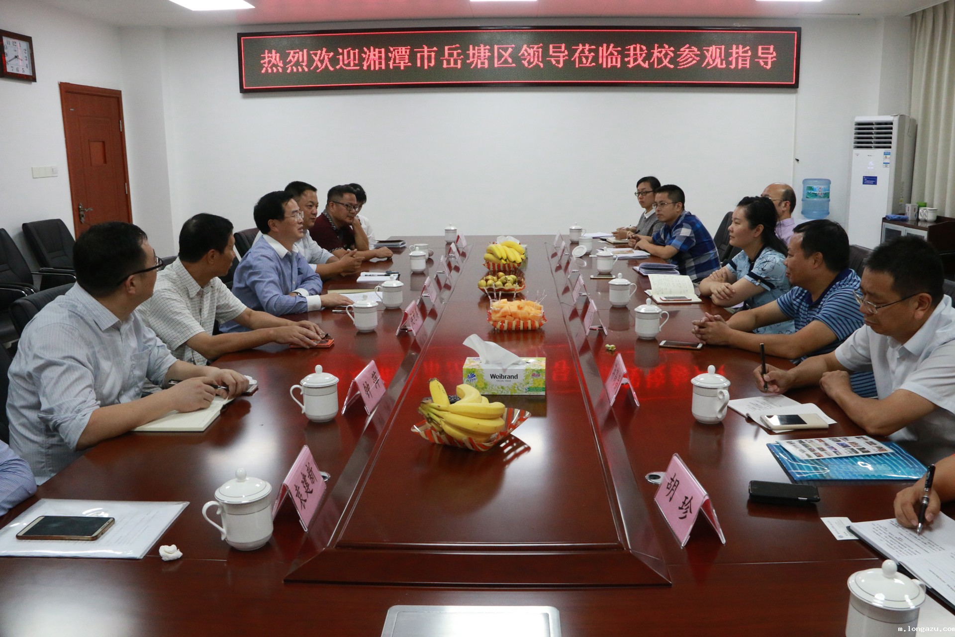 参观结束后,岳塘区领导和我校校级领导进行了座谈。张胜利校长向客人们介绍了学校办学历程、硬件设施、师资力量和校园文化。同时,也从教育教学特色和整体规划特色两方面介绍了我校的办学特色。张校长介绍了学校的基本情况之后,岳塘区领导们充分肯定了学校的硬件建设和文化建设,高度赞扬了我校的办学理念、发展目标和办学目标,希望今后有机会进一步加强交流!