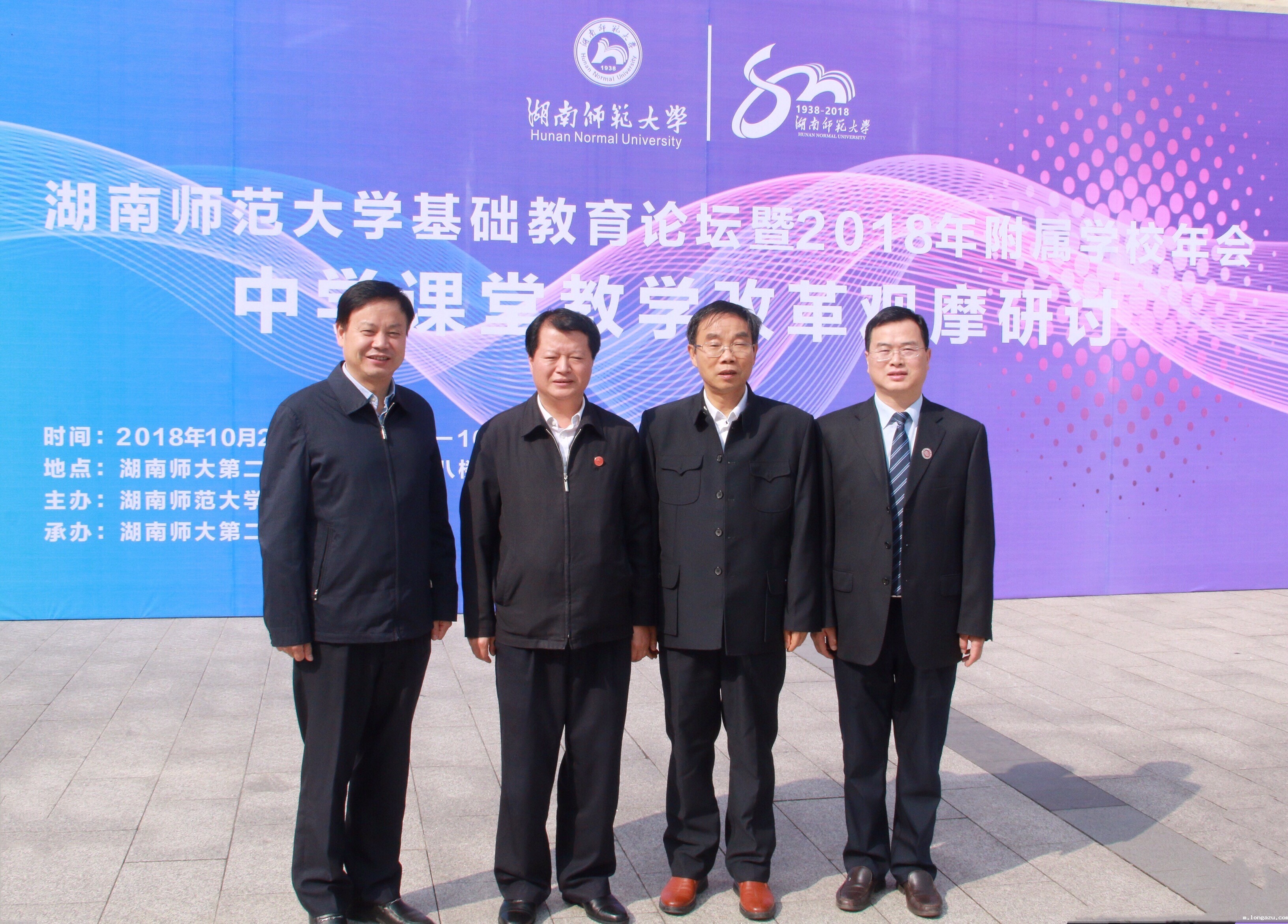 我校校长张胜利(右1)与亲临现场指导的湖南师范大学基础教育中心主任龚民(左2)、湖南师范大学师资创新发展院院长熊川武(右2)、湖南师大附中校长谢永红(左1)合影留念