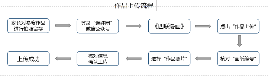参赛选手作品创作完成后,由家长进行作品拍照/扫描,登录官方平台“遛娃团”微信公众号进行“作品上传”,根据提示及要求完成作品上传后,作品即可在线上展厅进行展览。