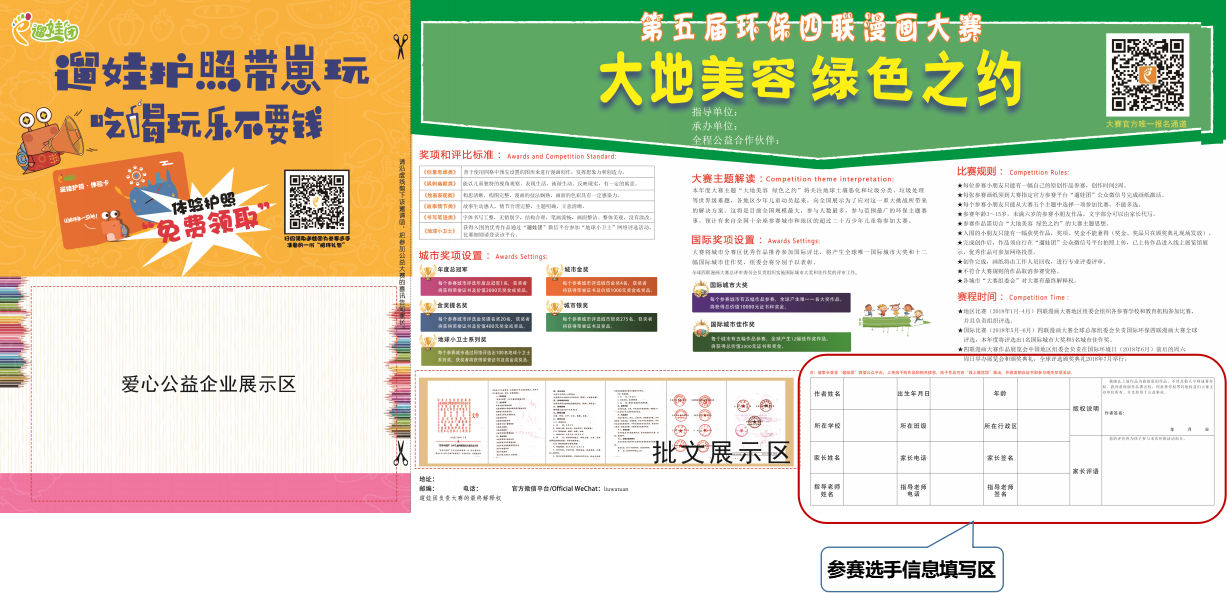 4、参赛选手必须拥有健康正确的社会价值观,遵守国家相关法律法规,监护人对其作品及言论负有监督和法律责任;参赛选手具有一定环保公益意识,家长主动引导,自愿参加环保公益赛事,并自愿积极主动参与公益环保理念传播。