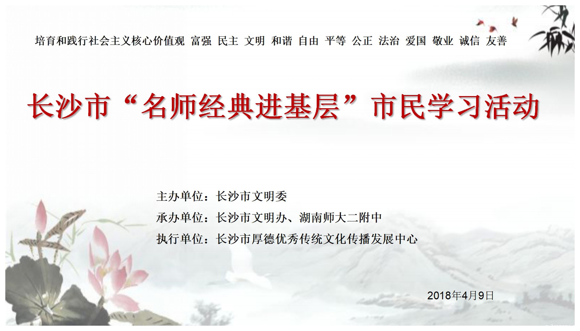 4月9日,长沙市“名师经典进基层”活动走进我校。在长沙市文明办的大力支持、长沙市厚德优秀传统文化传播发展中心和麓丰社区的积极配合下,校团委联合高一年级组成功举办了以“《孝经》与孝顺”为主题的孝道文化专题讲座。校长张胜利、学生处副主任兼团委书记王成出席了本次活动,高一年级600余名同学及班主任现场聆听讲座。